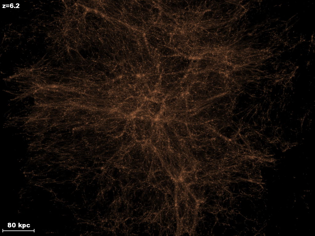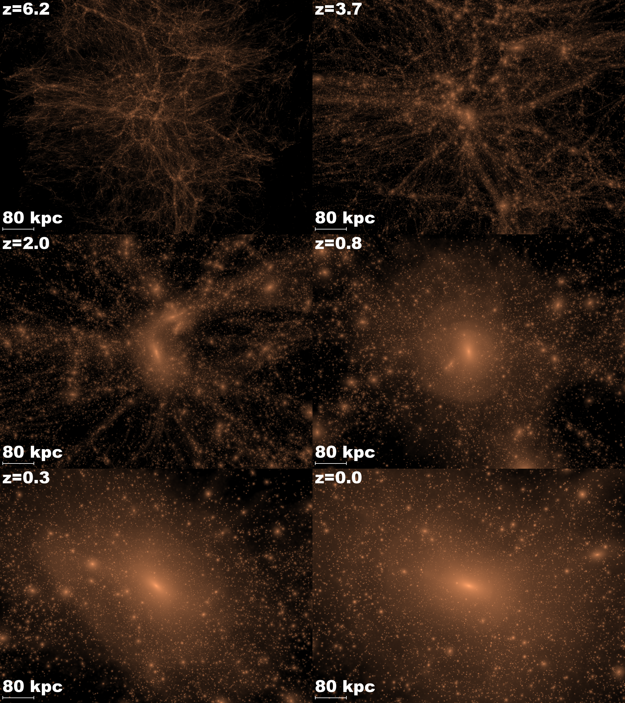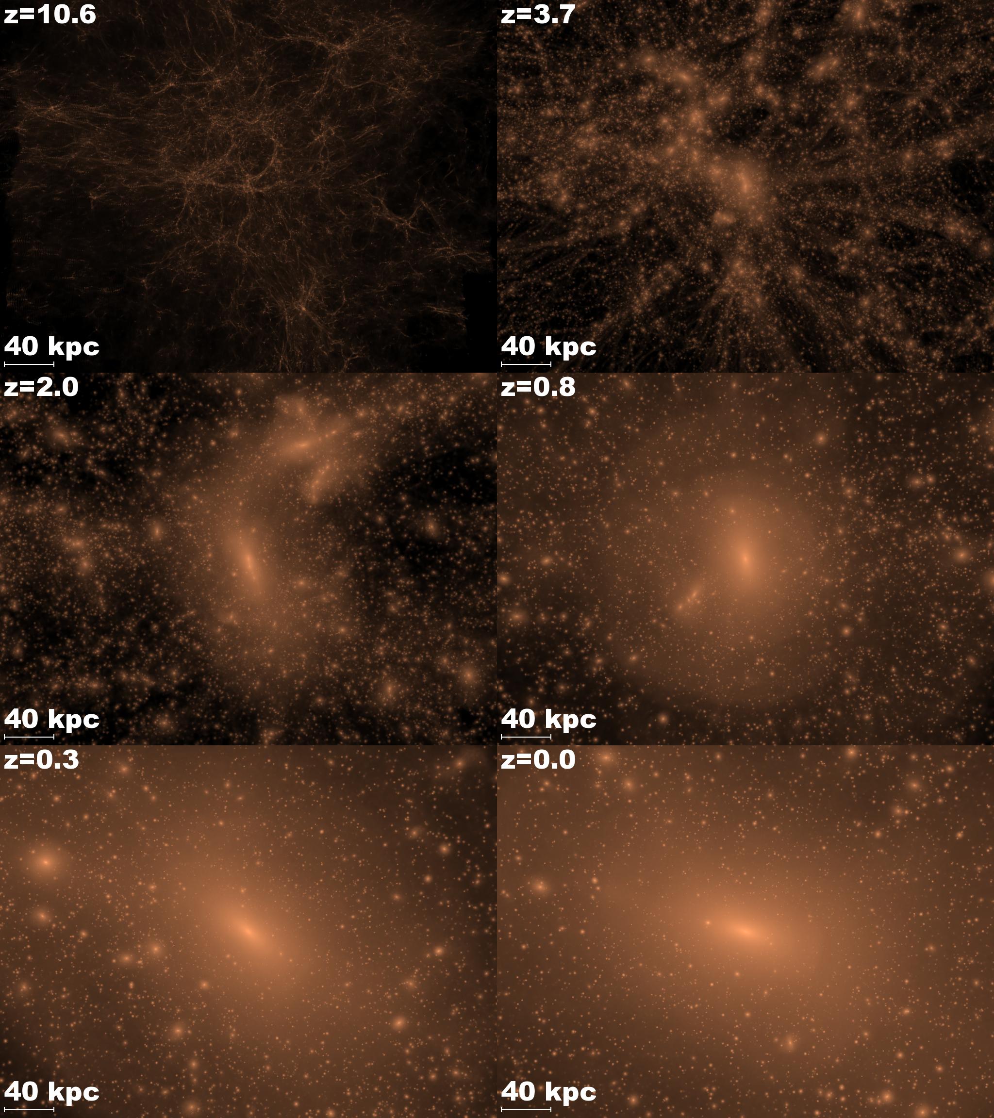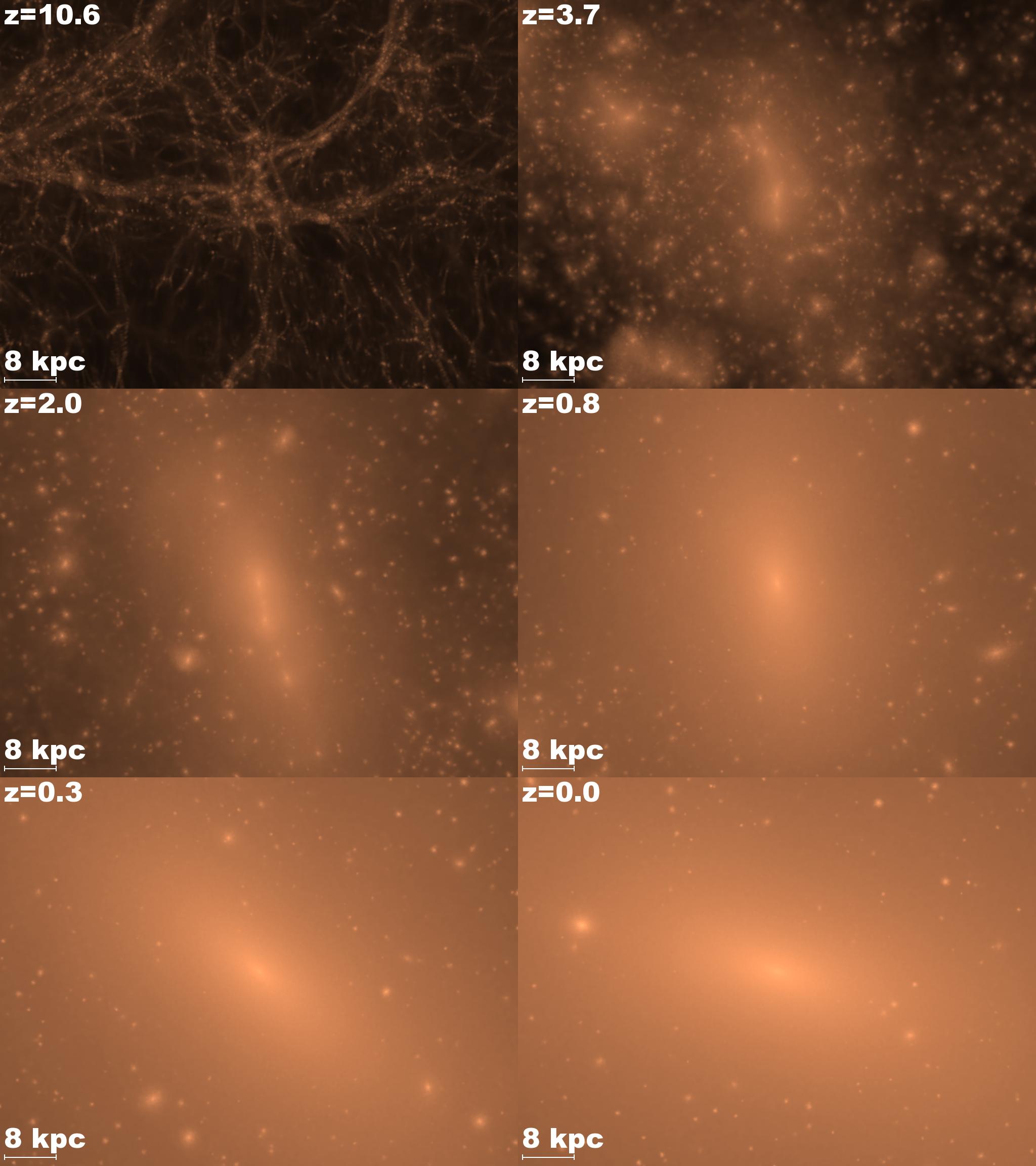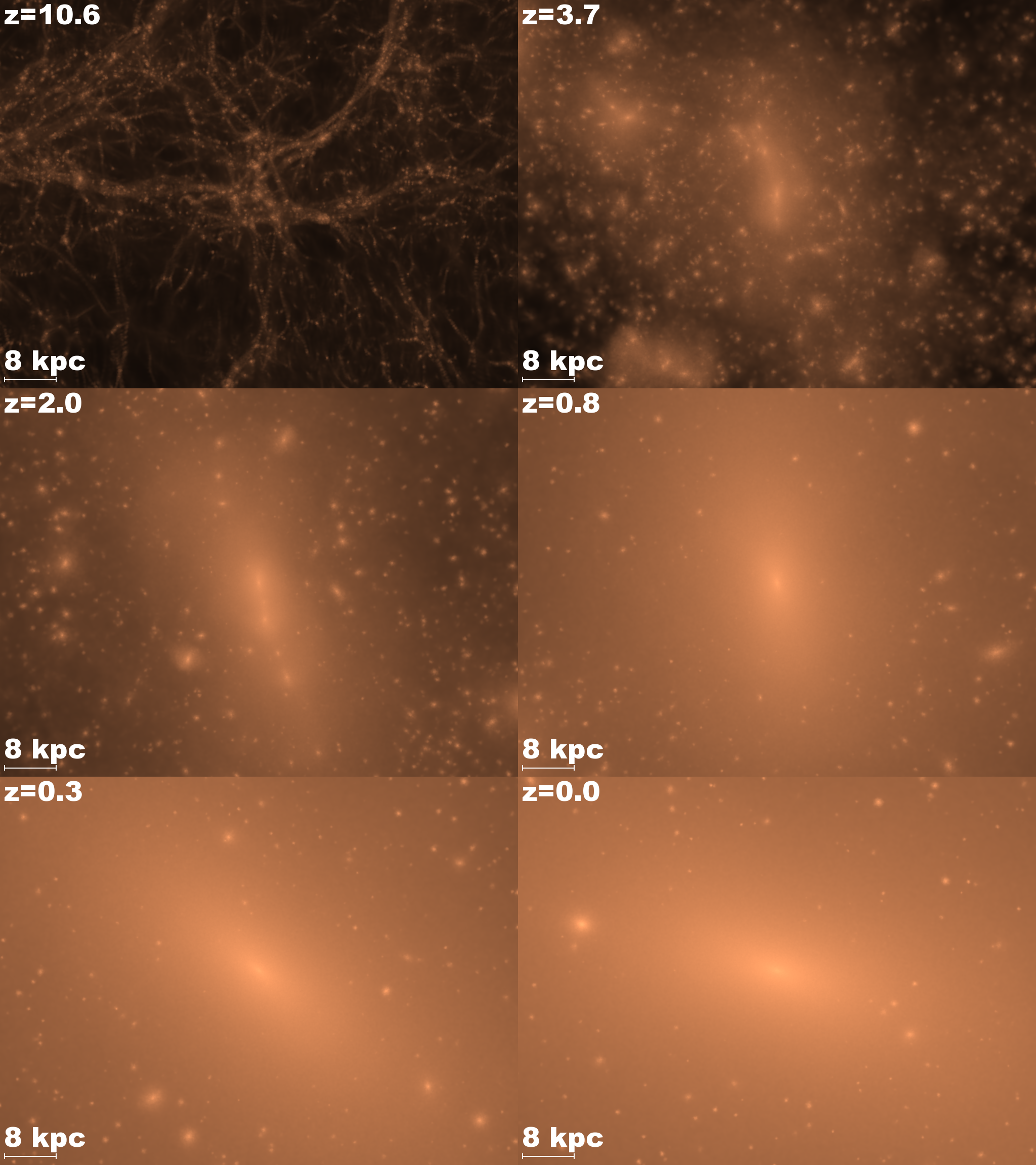 VL-1 images :  z=0   low resolution,z=0   z=0.3   z=0.8  z=2.0   z=3.7  z=6.2   z=10.6  composites   sub-subhalosProjected dark matter density-square maps of the simulated Milky Way-size halo Via Lactea-1 at the various epochs. The logarithmic color scale covers the same 24 decades in projected density-square in physical units in each panel. Most images are 1024x768 pixels (composites are larger) and they are available as full quality PNG version and as smaller, compressed version in JPEG format.at z=0, i.e. today