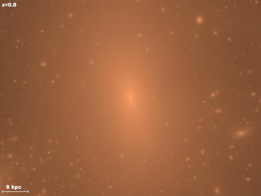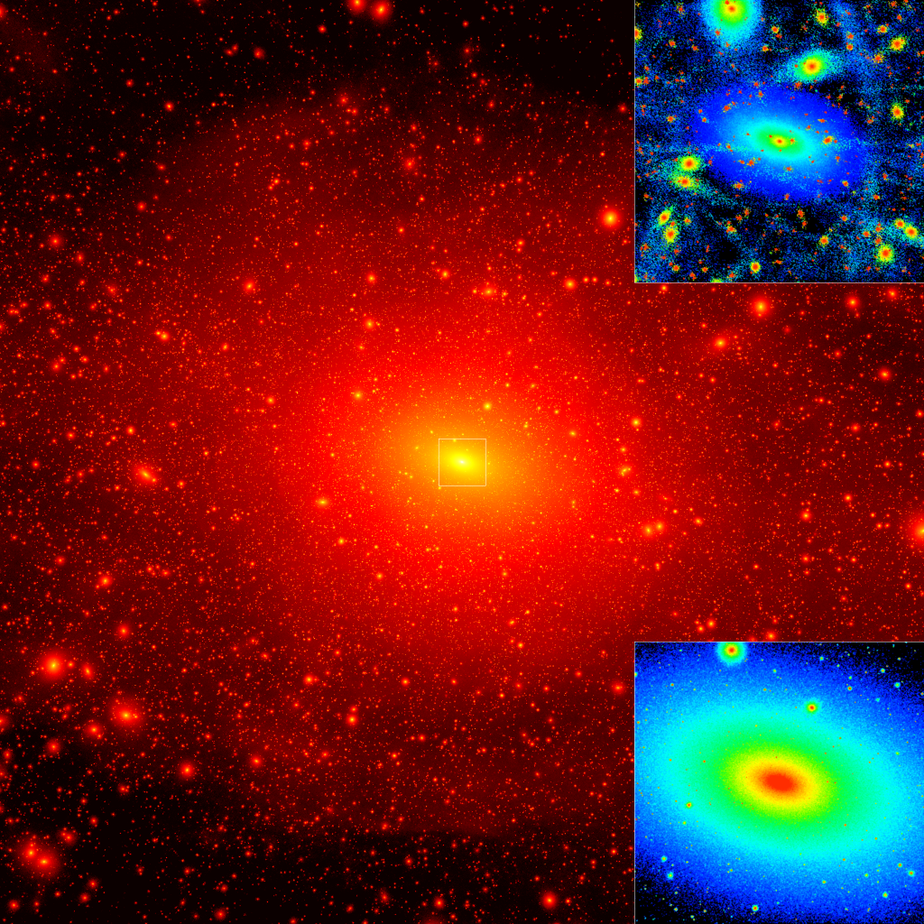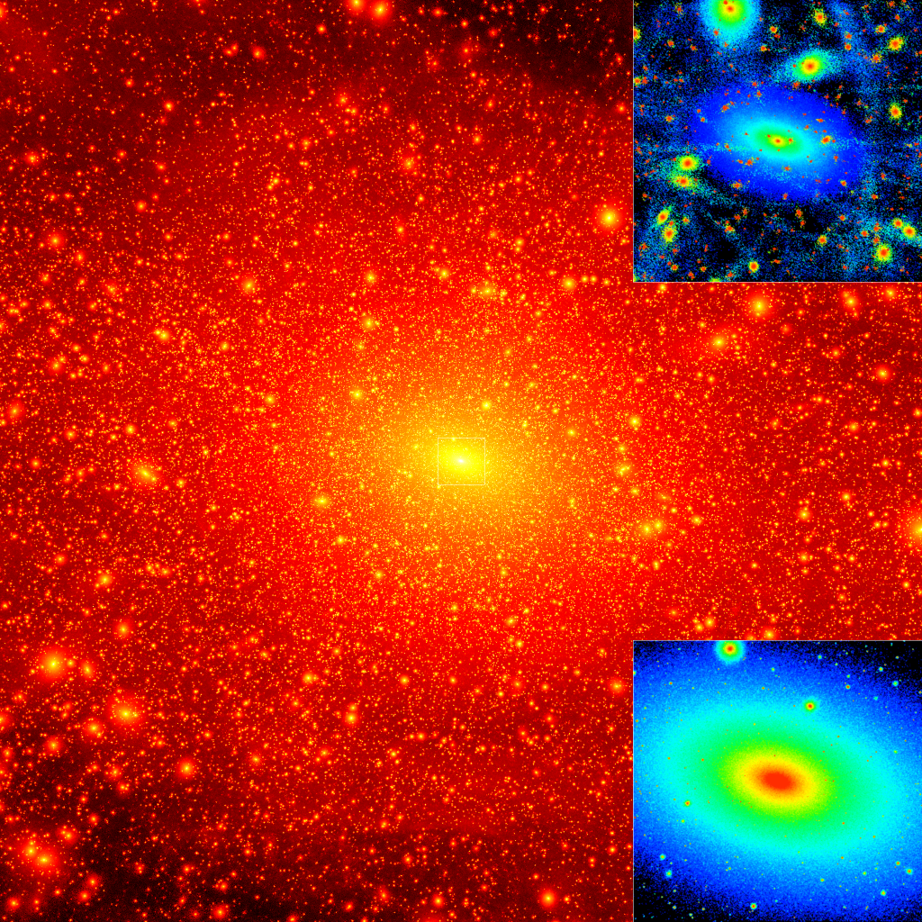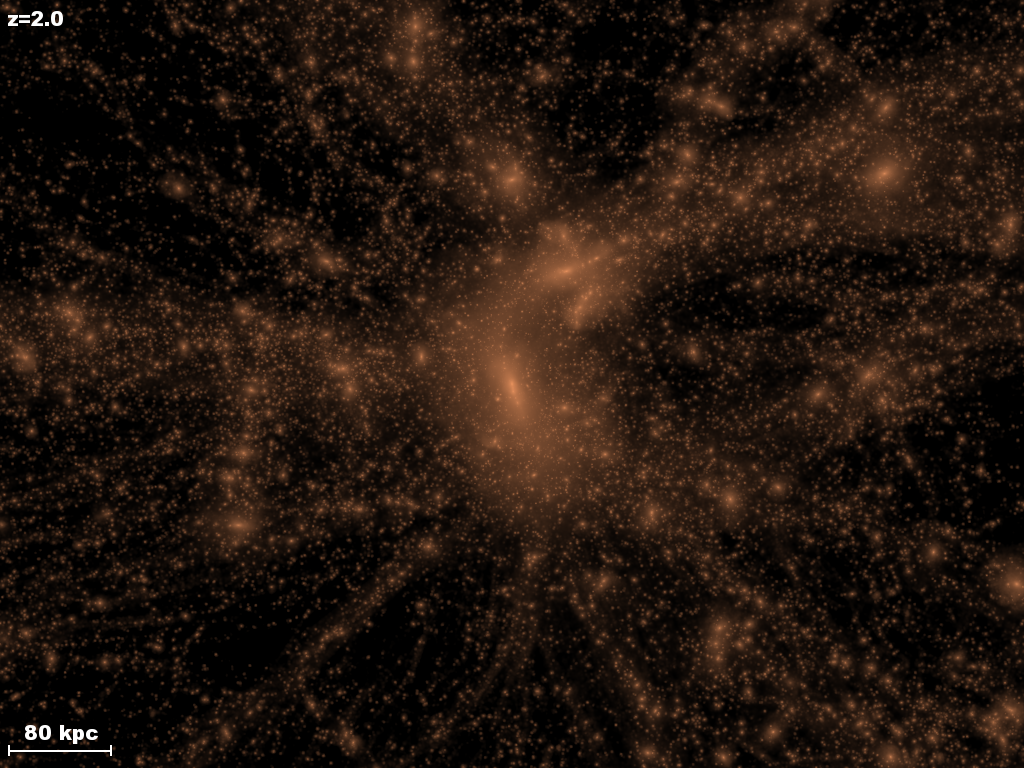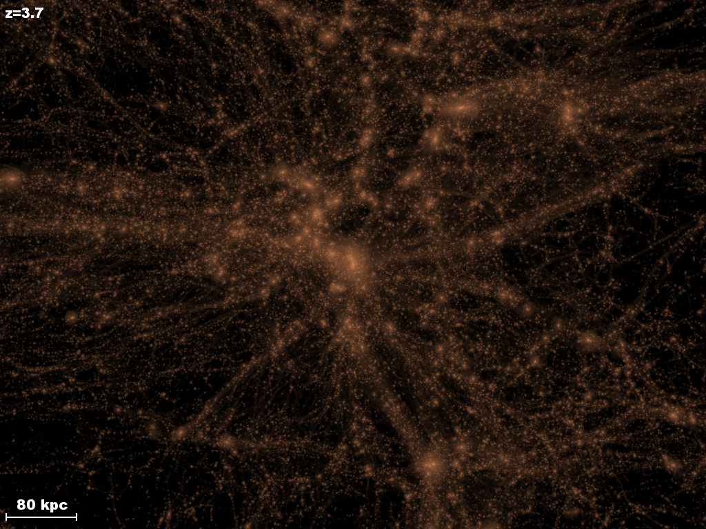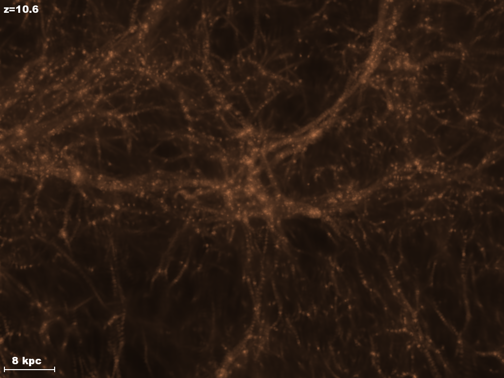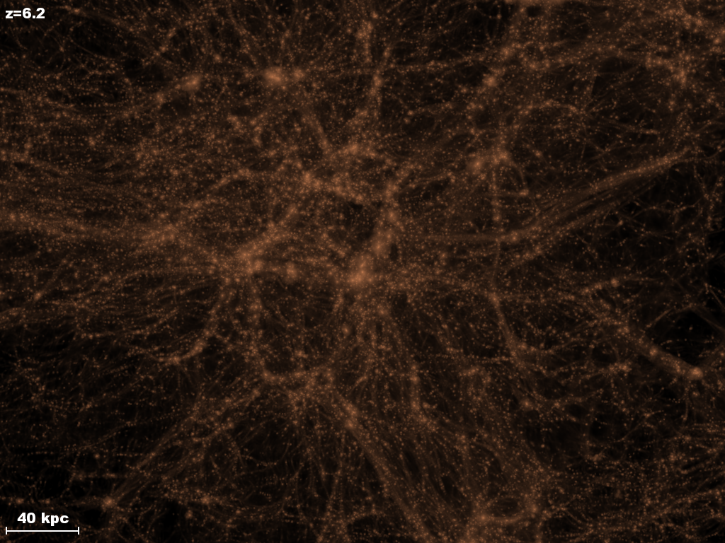 VL-1 images :  z=0   low resolution,z=0   z=0.3   z=0.8  z=2.0   z=3.7  z=6.2   z=10.6  composites   sub-subhalosProjected dark matter density-square maps of the simulated Milky Way-size halo Via Lactea-1 at the various epochs. The logarithmic color scale covers the same 24 decades in projected density-square in physical units in each panel. Most images are 1024x768 pixels (composites are larger) and they are available as full quality PNG version and as smaller, compressed version in JPEG format.at z=0, i.e. today
