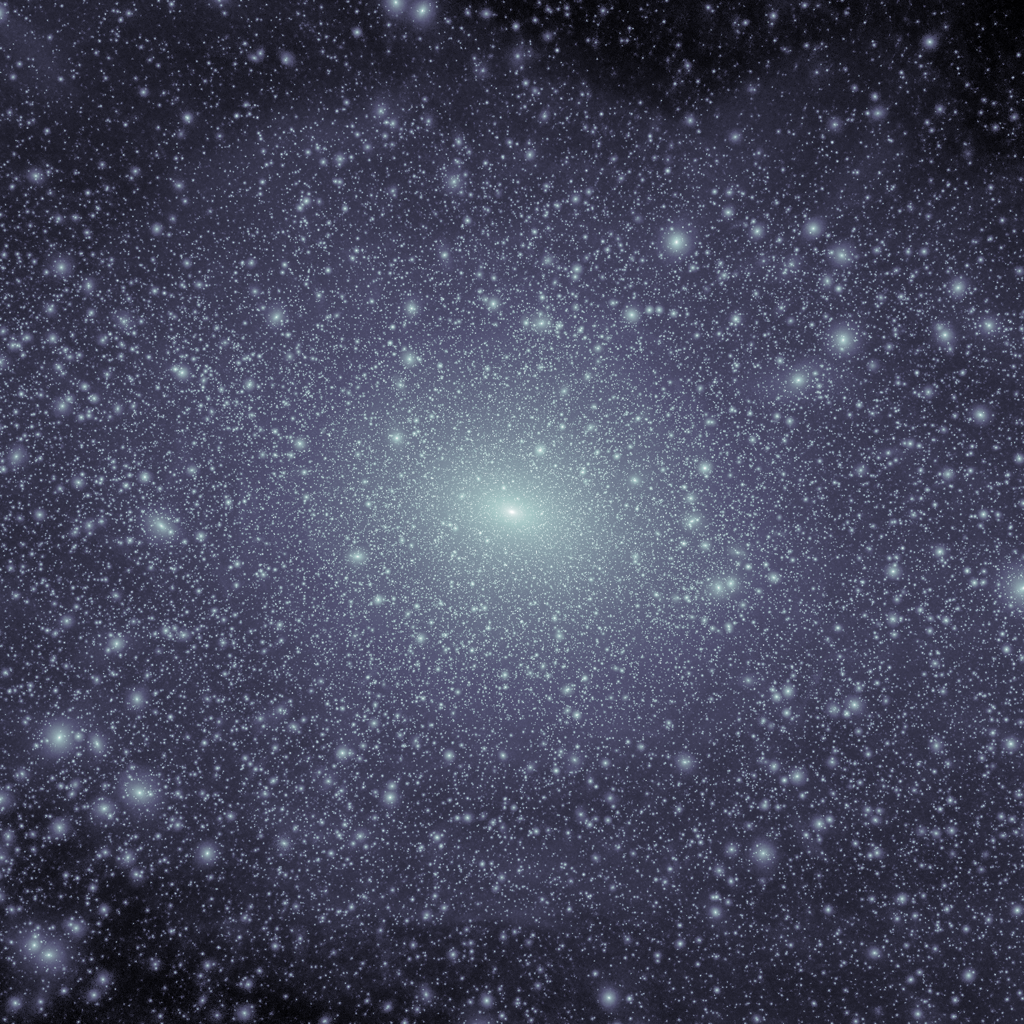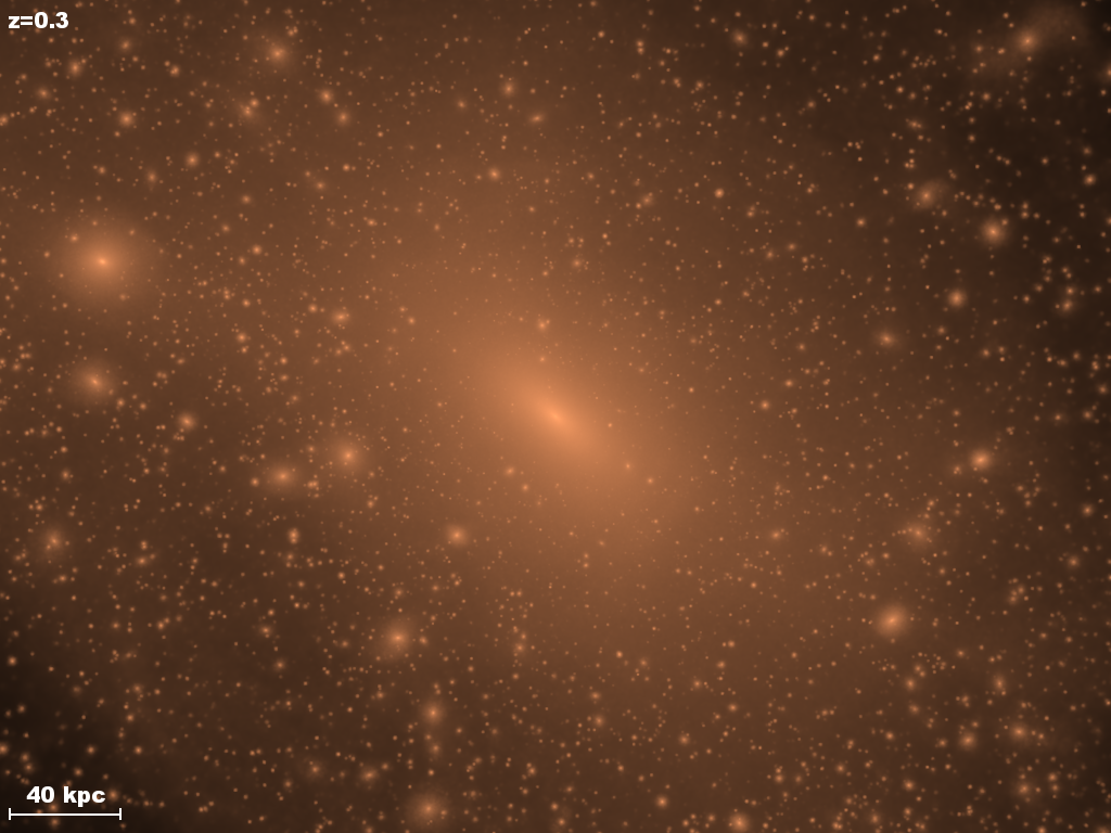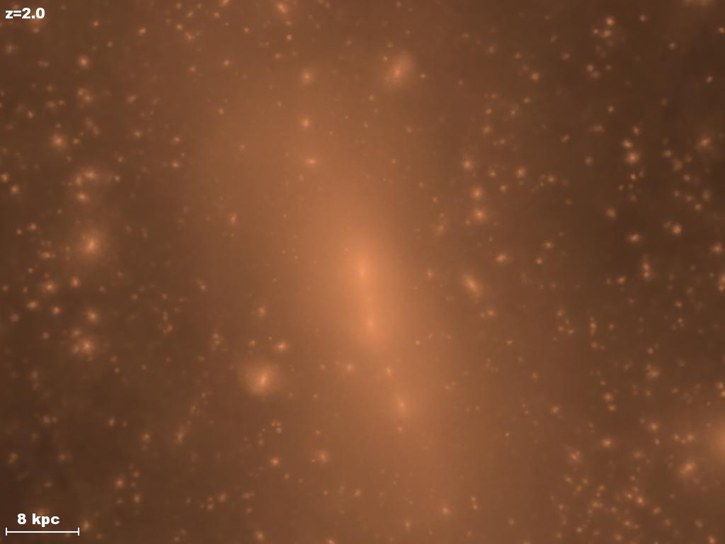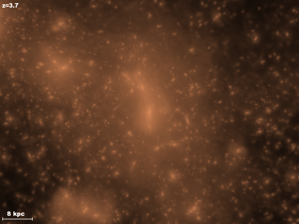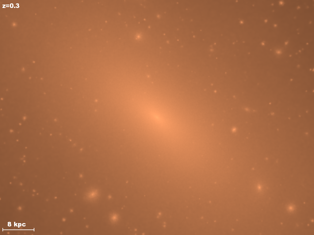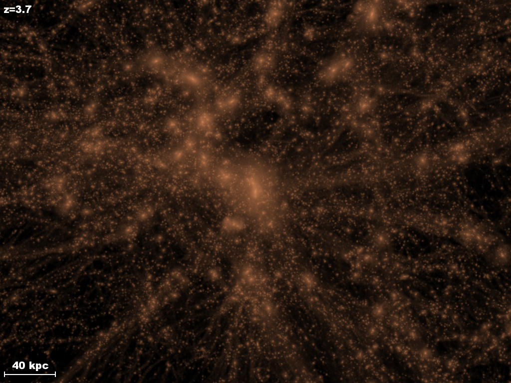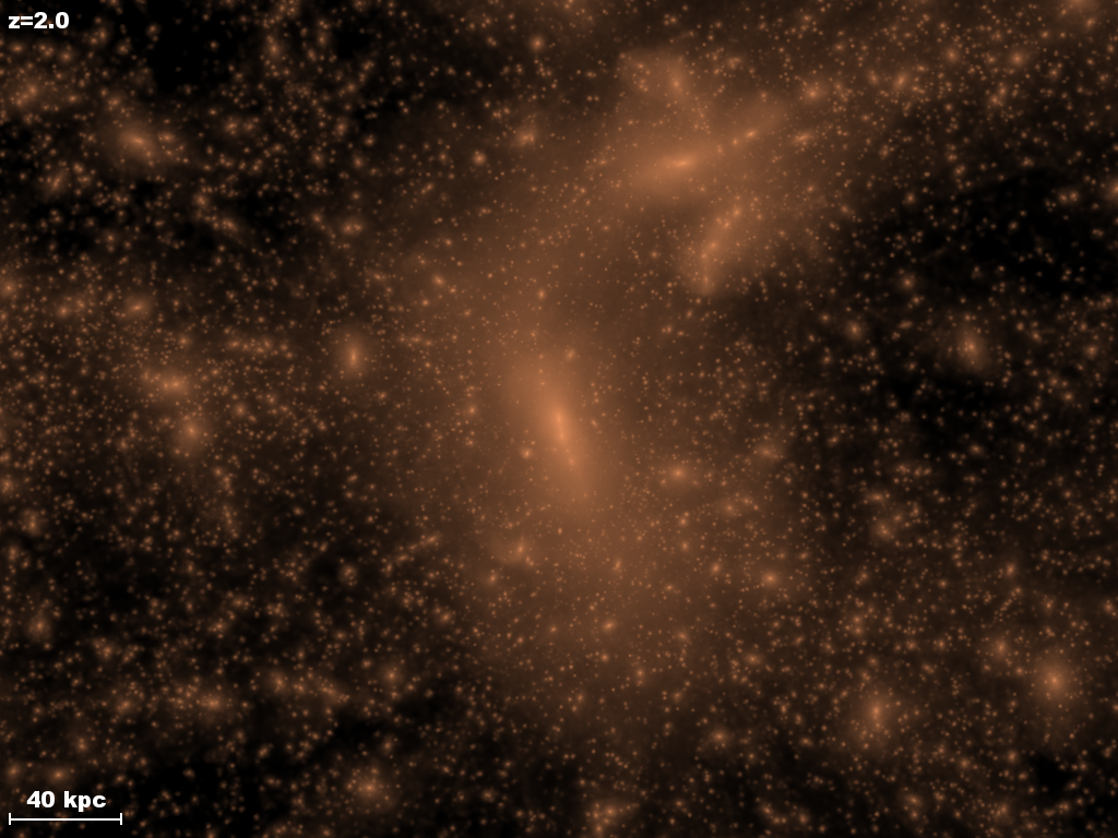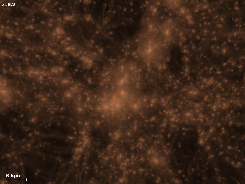VL-1 images :  z=0   low resolution,z=0   z=0.3   z=0.8  z=2.0   z=3.7  z=6.2   z=10.6  composites   sub-subhalosProjected dark matter density-square maps of the simulated Milky Way-size halo Via Lactea-1 at the various epochs. The logarithmic color scale covers the same 24 decades in projected density-square in physical units in each panel. Most images are 1024x768 pixels (composites are larger) and they are available as full quality PNG version and as smaller, compressed version in JPEG format.at z=0, i.e. today