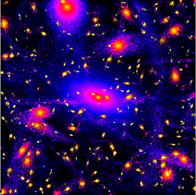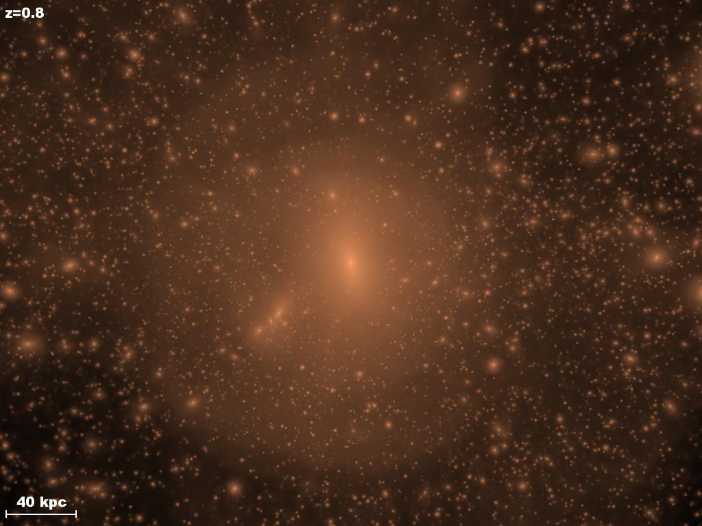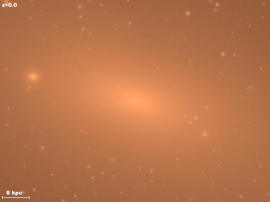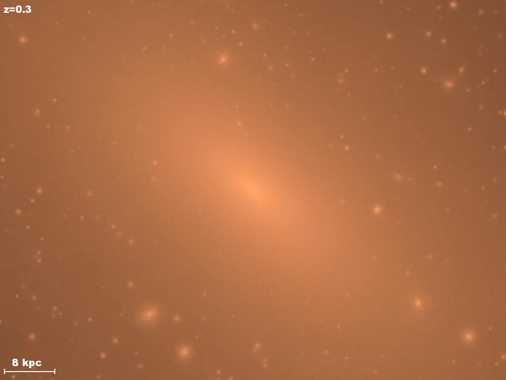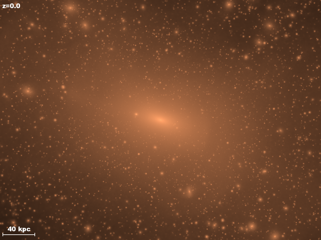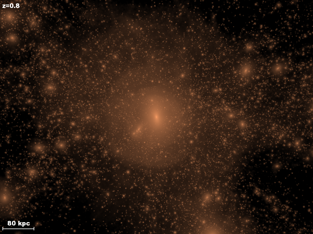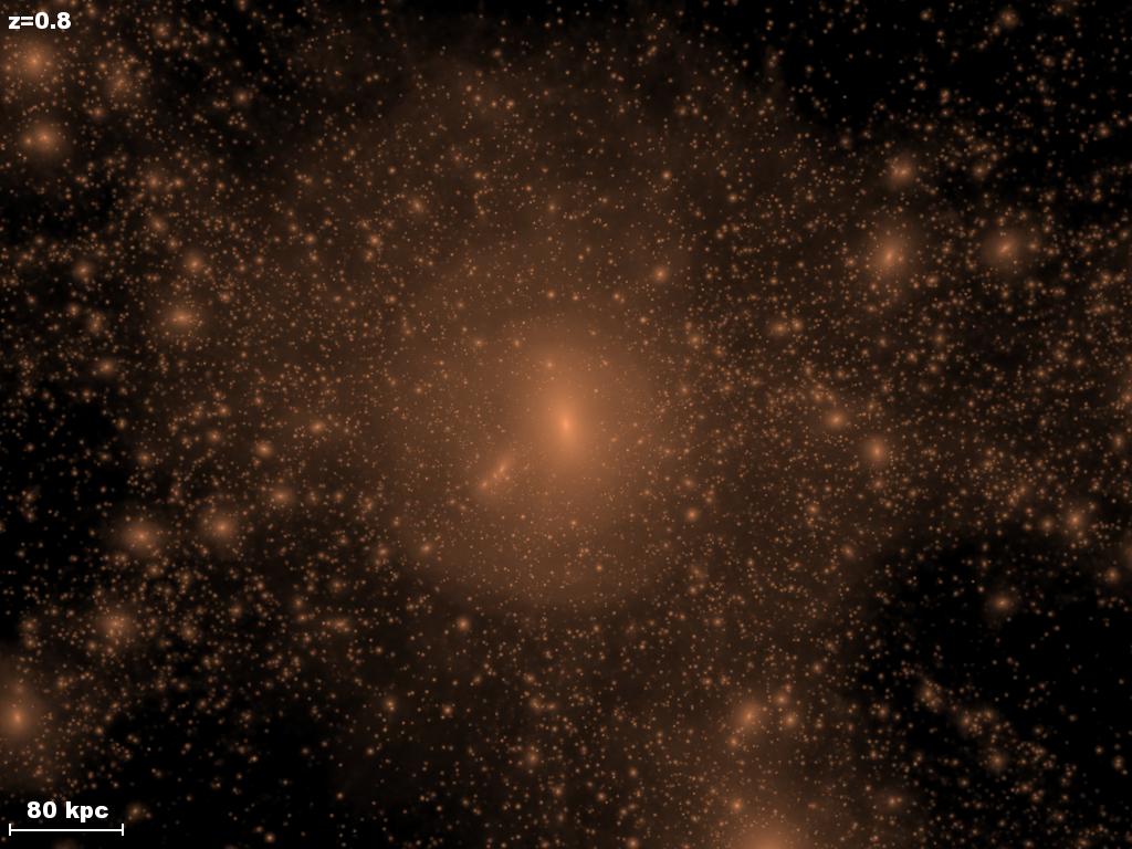 VL-1 images :  z=0   low resolution,z=0   z=0.3   z=0.8  z=2.0   z=3.7  z=6.2   z=10.6  composites   sub-subhalosProjected dark matter density-square maps of the simulated Milky Way-size halo Via Lactea-1 at the various epochs. The logarithmic color scale covers the same 24 decades in projected density-square in physical units in each panel. Most images are 1024x768 pixels (composites are larger) and they are available as full quality PNG version and as smaller, compressed version in JPEG format.at z=0, i.e. today