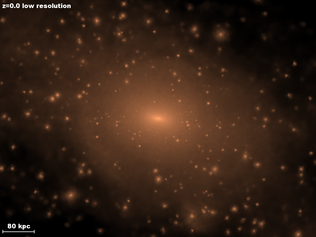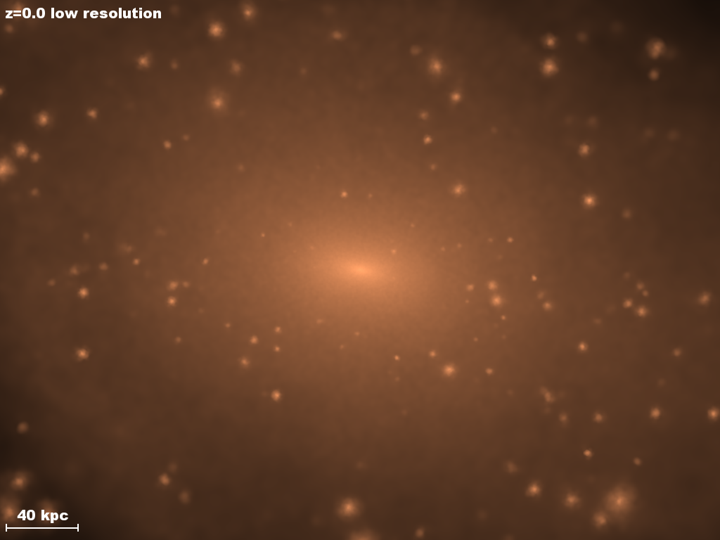low resolution simulation (27 times fewer particles) also at z=0, for comparison