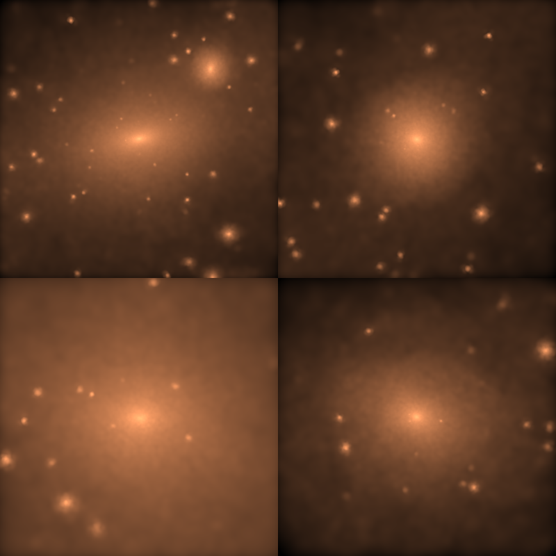 sub-subhalos at z=0 Projected dark matter density-square maps of the four most massive subhalos within the simulated Milky Way host at the present epoch. Sub-substructure is clearly visible. On the left, only dark matter particles within the tidal radius are used for the projections. On the right, dark matter particles within a cube enclosing the tidal radius are used. See astro-ph/0611370 for details.
