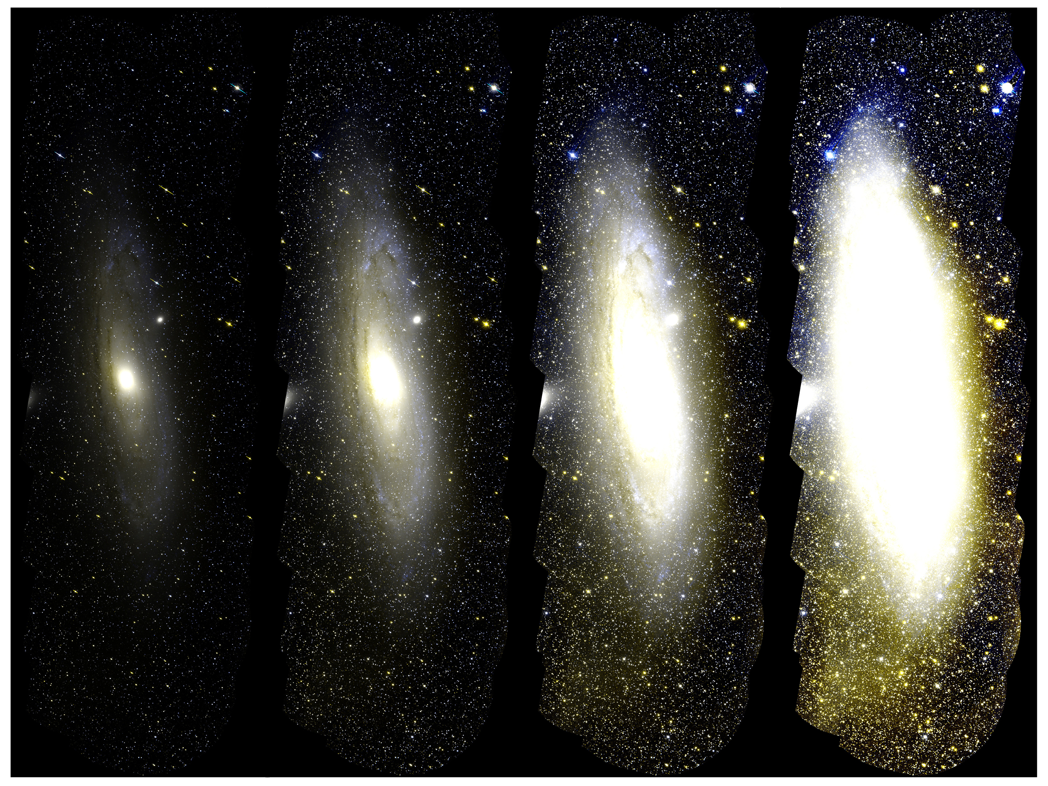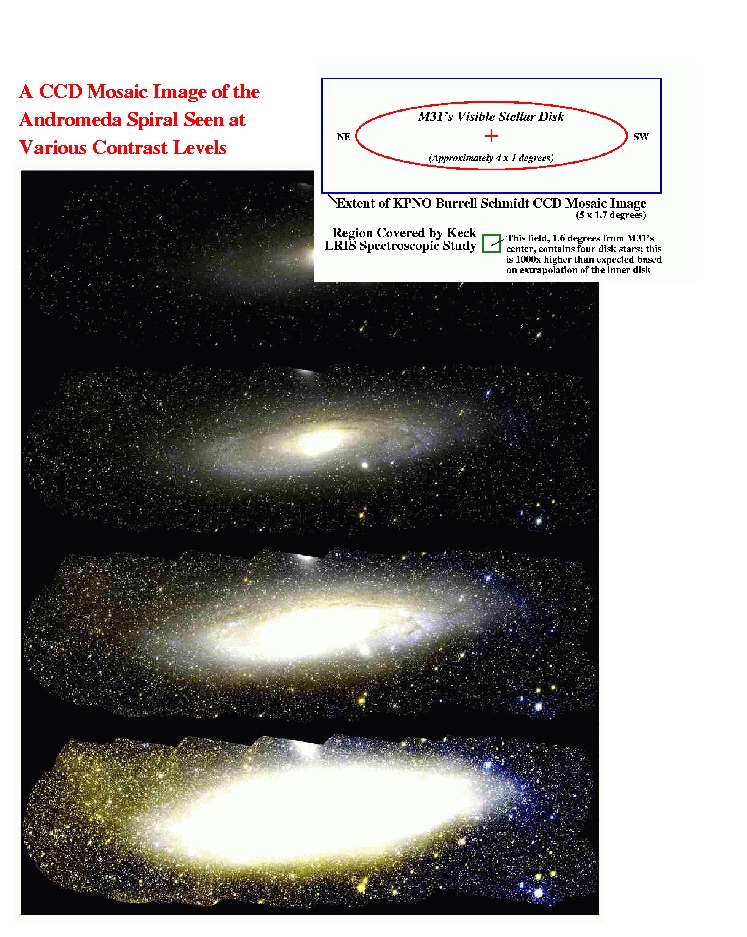 Older observations using photographic plates had suggested the same thing, but the features are so faint that they were at the limit of photographic detectability and were obscured by artifacts on the plates, Guhathakurta said. Modern digital cameras are far more sensitive than photographic plates, although they cannot yet cover as wide a field of view. In order to image the entire stellar disk of Andromeda, which covers an area of the sky several times the size of the full moon, the researchers had to take multiple images of adjacent areas of the sky and fit them together into a mosaic.