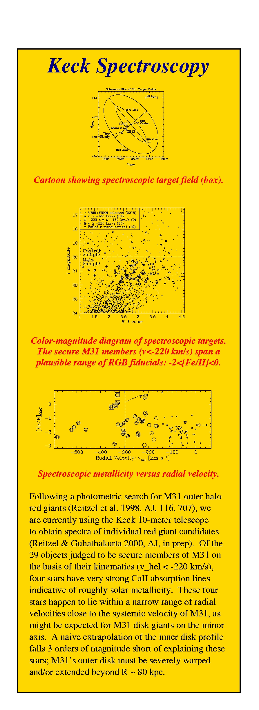 Much to their surprise, however, four of the 30 stars they observed had properties characteristic of disk stars. Reitzel, who conducted the study as a graduate student at UCSC, had set out to study the chemical compositions of red-giant stars in the spheroid component of Andromeda, using the LRIS spectrograph on the 10-meter Keck II Telescope in Hawaii. These stars would be expected to have relatively low abundances of metals. In addition, their random orbits (unlike the coherent motions of stars in the disk) should result in a broad distribution of velocities relative to the Sun. In both metallicity and velocity, the four stars stood out as having the properties of disk stars.