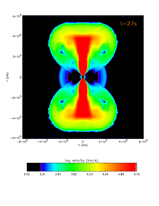 The jet shown here at 27 seconds has overtaken the supernova shock and will reach the surface of the star and cause an asperical explosion before the spherical supernova propogates out of the central regions of the star. The jet is powered by one tenth of a percent (0.001) of the rest mass energy which is falling through the inner boundary in the equatorial region (black). The colors represent the logarithm of radial velocity in kilometers per second. The fastest material (red) is travelling at nearly half the speed of light. The spherical blue region is the supernova explosion which contains more than 2.5x10^50 ergs of energy and is traveling at a few thousand kilometers per second. The thin red circle represents the edge of the carbon/oxygen core of the star. The rest of the star exterior to the circle is composed primarily of helium.