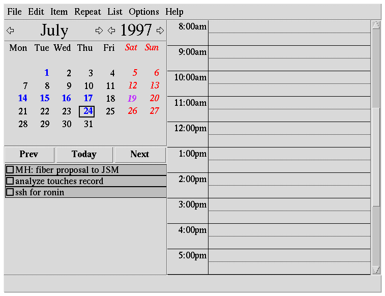 Pictures of Real Tcl/Tk ApplicationsSanjay Ghemawat wrote ical. Ical is really cool. It can load multiple calendars for an overview of several people's commitments. The calendar files are ASCII and very readable (also can be code-generated, and we've done that with good results to make pretty calendars of observing schedules, car signouts, Diner reservations, etc.) Ical prints out nice PostScript calendars to scribble on. It's just a good, sound, reliable, beautifully crafted tool.