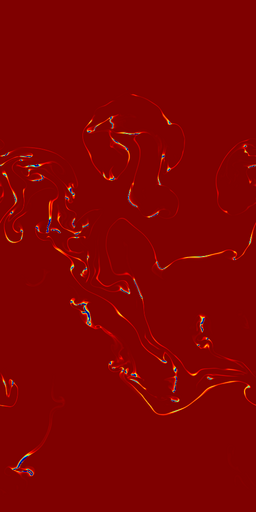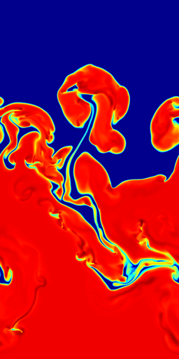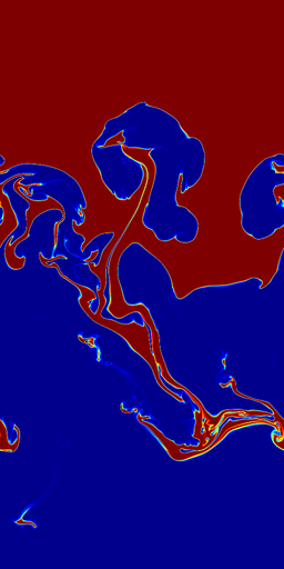 Simulations of a fully resolve 1.5 x 107 g/cc RT unstable carbon flame in a white dwarf. The domain is 216 x 432 cm (effective, fine grid size is 2048 x 4096 zones). The flame is moving up, and fresh fuel is fed in at the top at the laminar flame velocity.