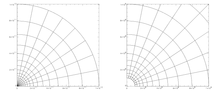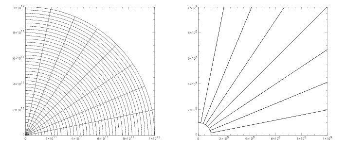 We can instead use a logarithmic spacing in the radial zones. In this case, each zone will be some constant factor wider in the radial direction than the one below it. The same grid as above, but using a logarithmic spacing in the radial direction is shown below.