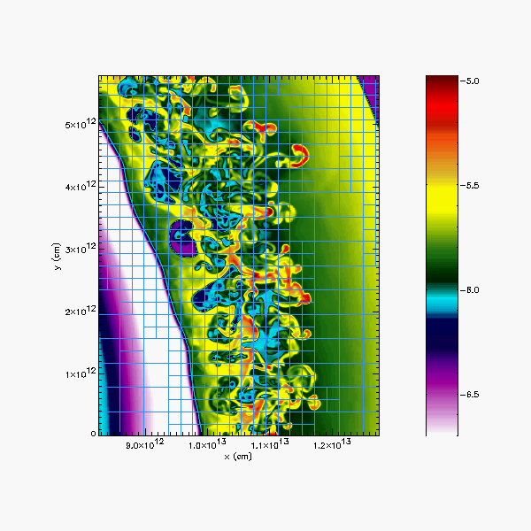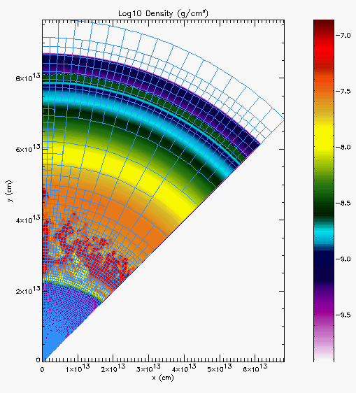 15 solar mass star undergoing a Type II supernova explosion, post bounce. We are interested in studying the mixing at the hydrogen interface as the shock wave moves outward. These images are ~ 6.8 hours after the start of the explosion. A Rayleigh-Taylor instability sets up at the hydrogen interface, just behind the shock wave. The blue boxes in the second image show our AMR block structure. Each block contains 256 computational zones. The effective resolution of these calculations varies as the shock moves outwards from the origin, but starts at 3.81e8 cm. The flow on axis is an artifact of the axisymmetric geometry, and does not interfere with the mixing, which is the focus of these calculations. These simulations are in 2-d axisymmetric geometry, and are being used to tune our refinement strategy for upcoming 3-d calculations.