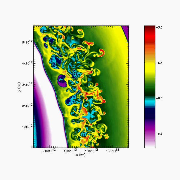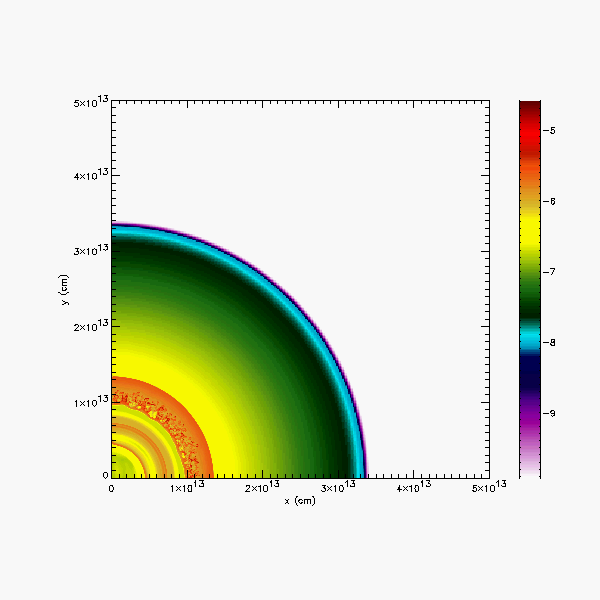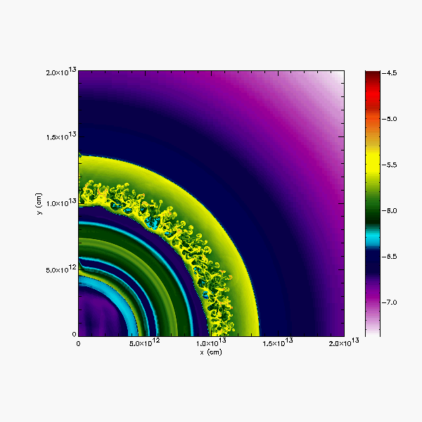 A large fraction of the computational domain, showing the shock at about 1.35e13 cm, and the Rayleigh-Taylor instability behind it.