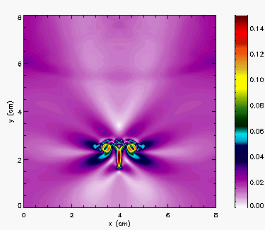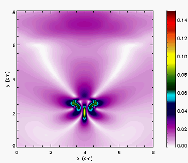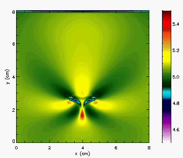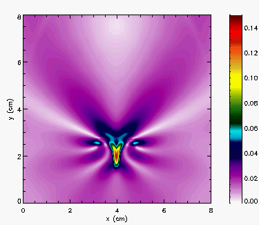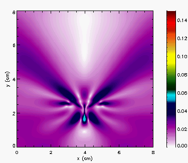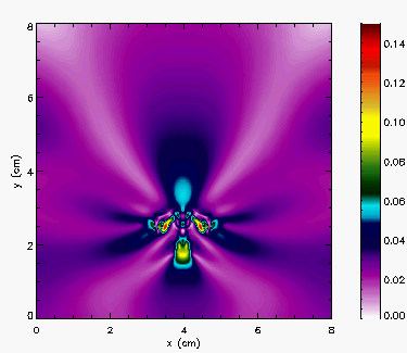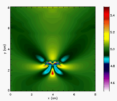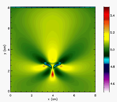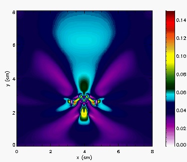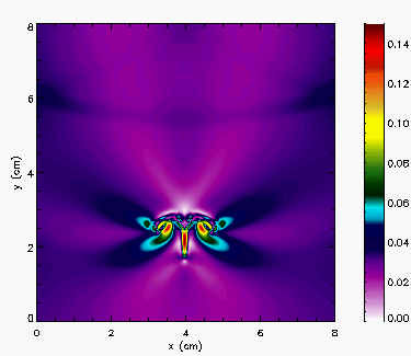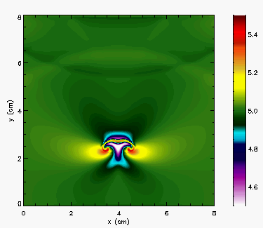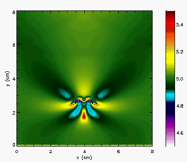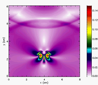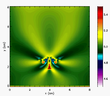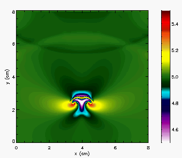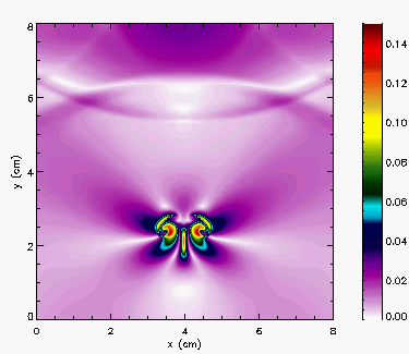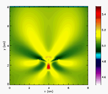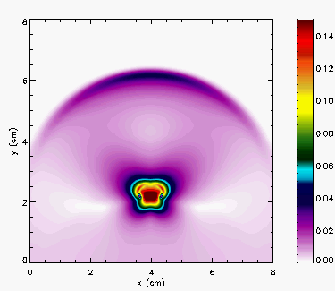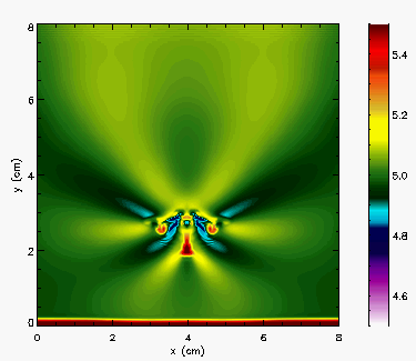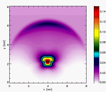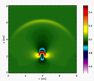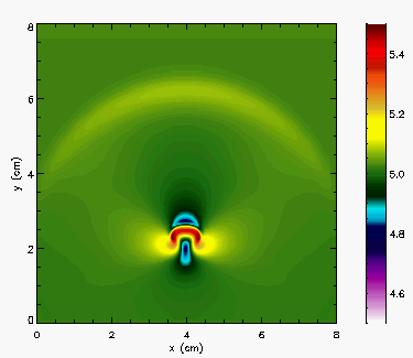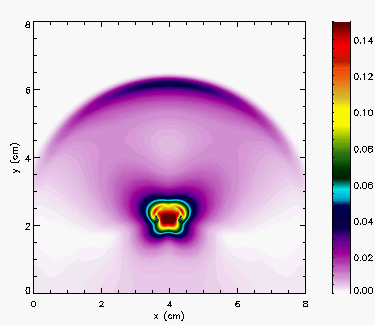 The PPM solver shows some wiggles in the internal energy field downstream of the bubble, which are not apparent in the unsplit calculation.